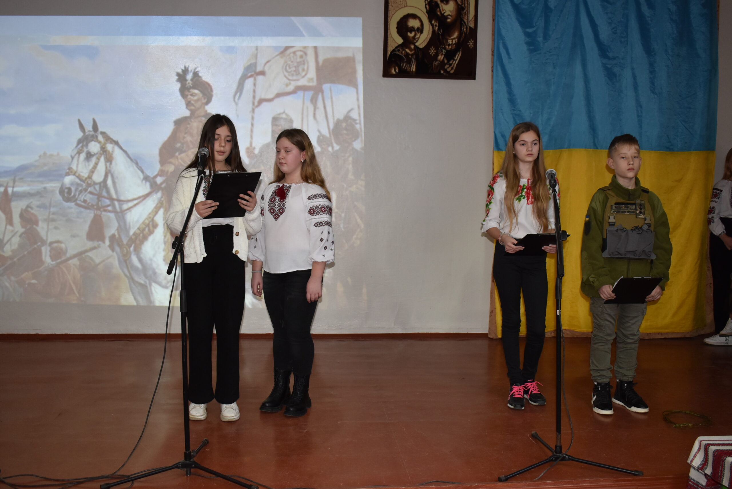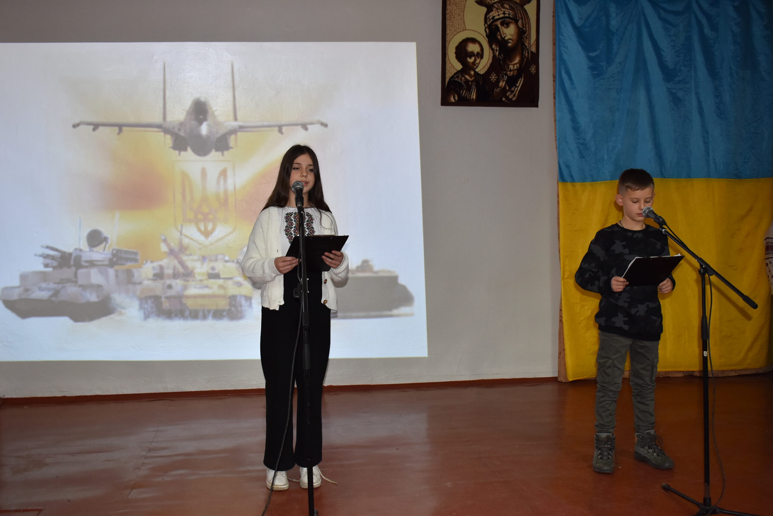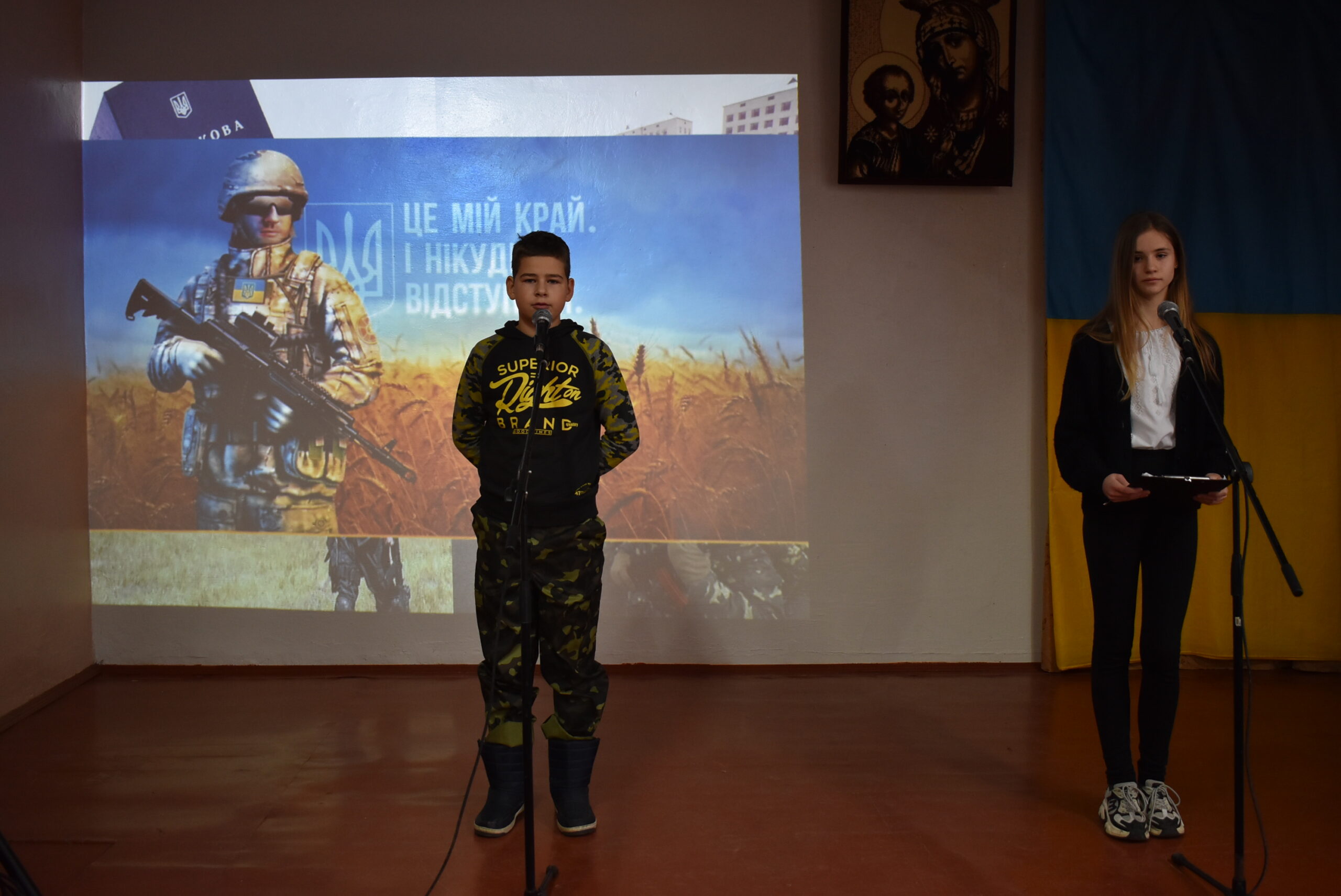 Вшановуючи наших захисників у їхнє професійне свято, учні розповіли присутнім про історію створення свята, про жертовність і подвиги усіх воїнів України від вільних козаків до сьогоднішнього дня, вшанували хвилиною мовчання Героїв, які і сьогодні кладуть своє життя за нас.