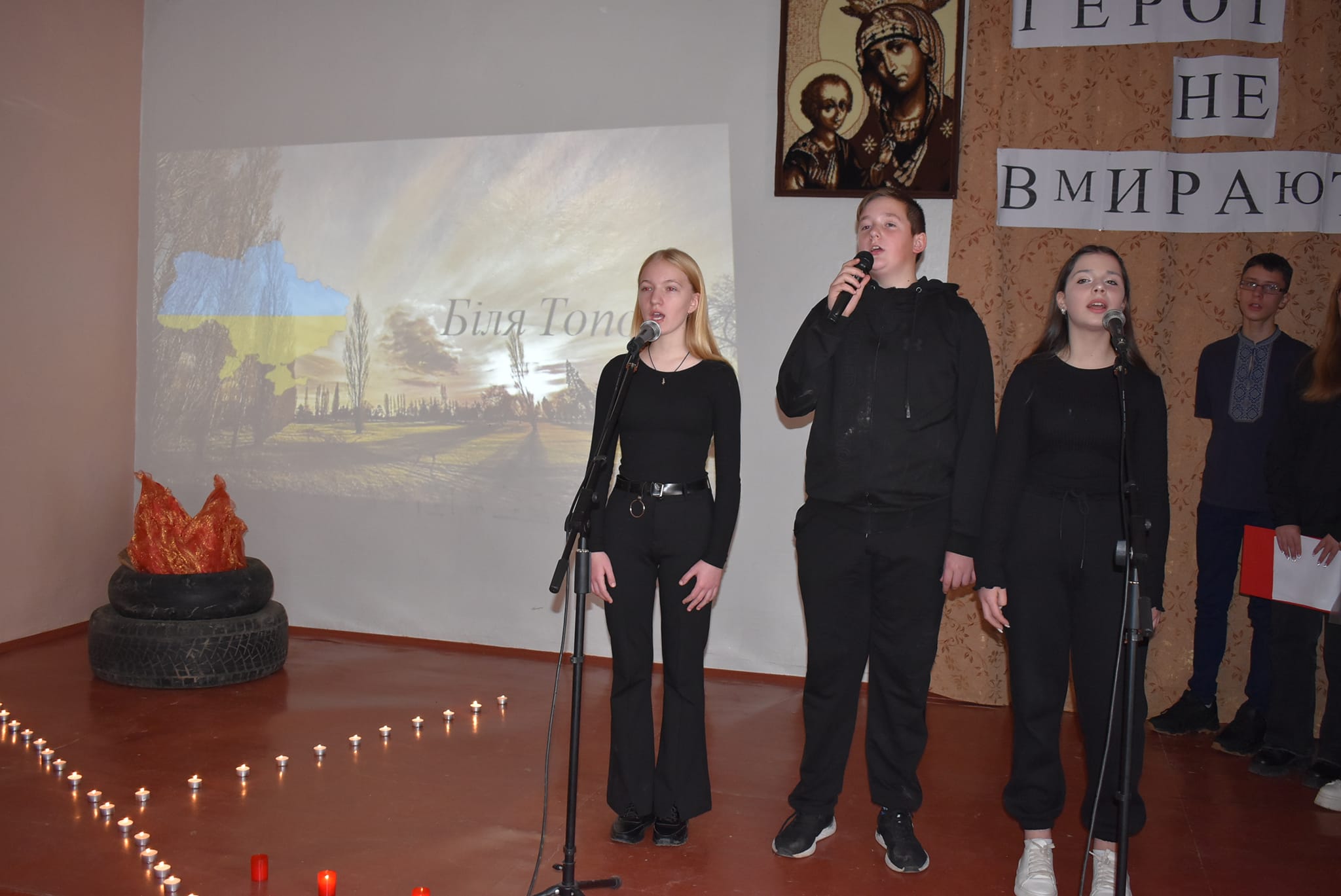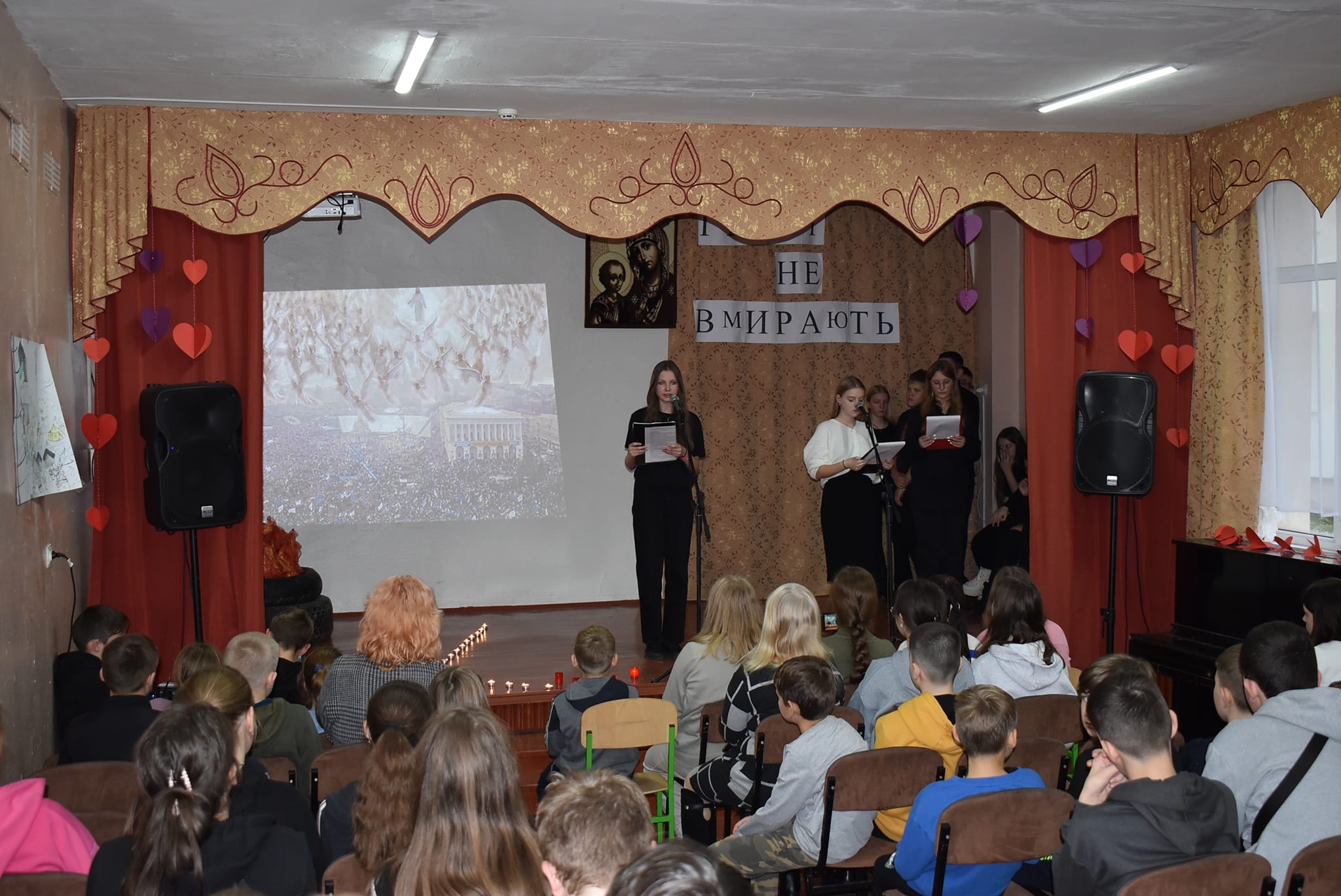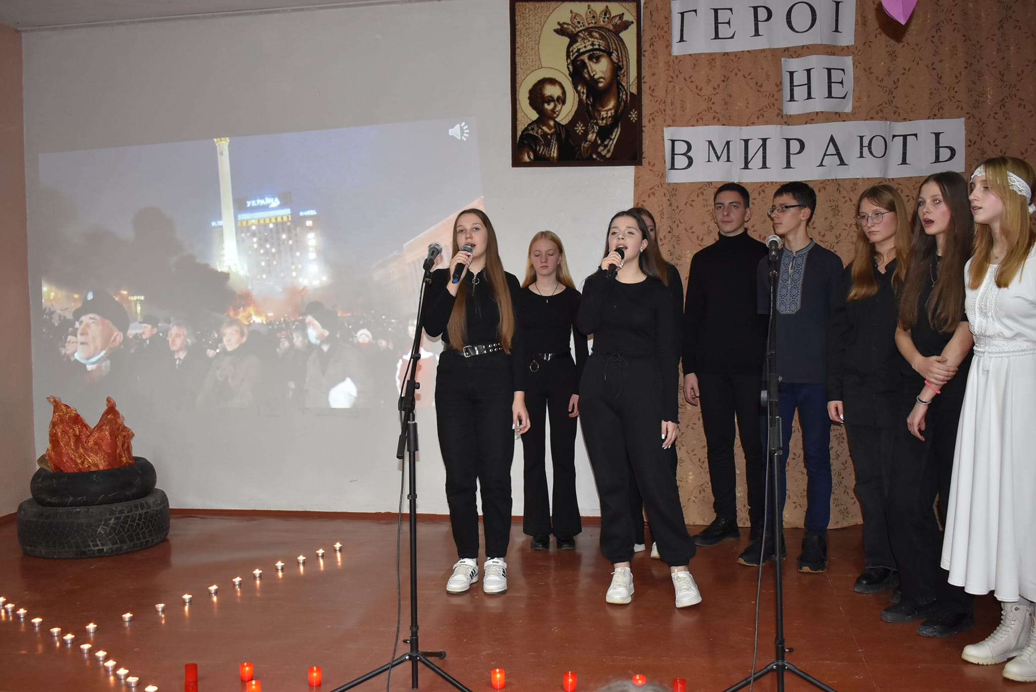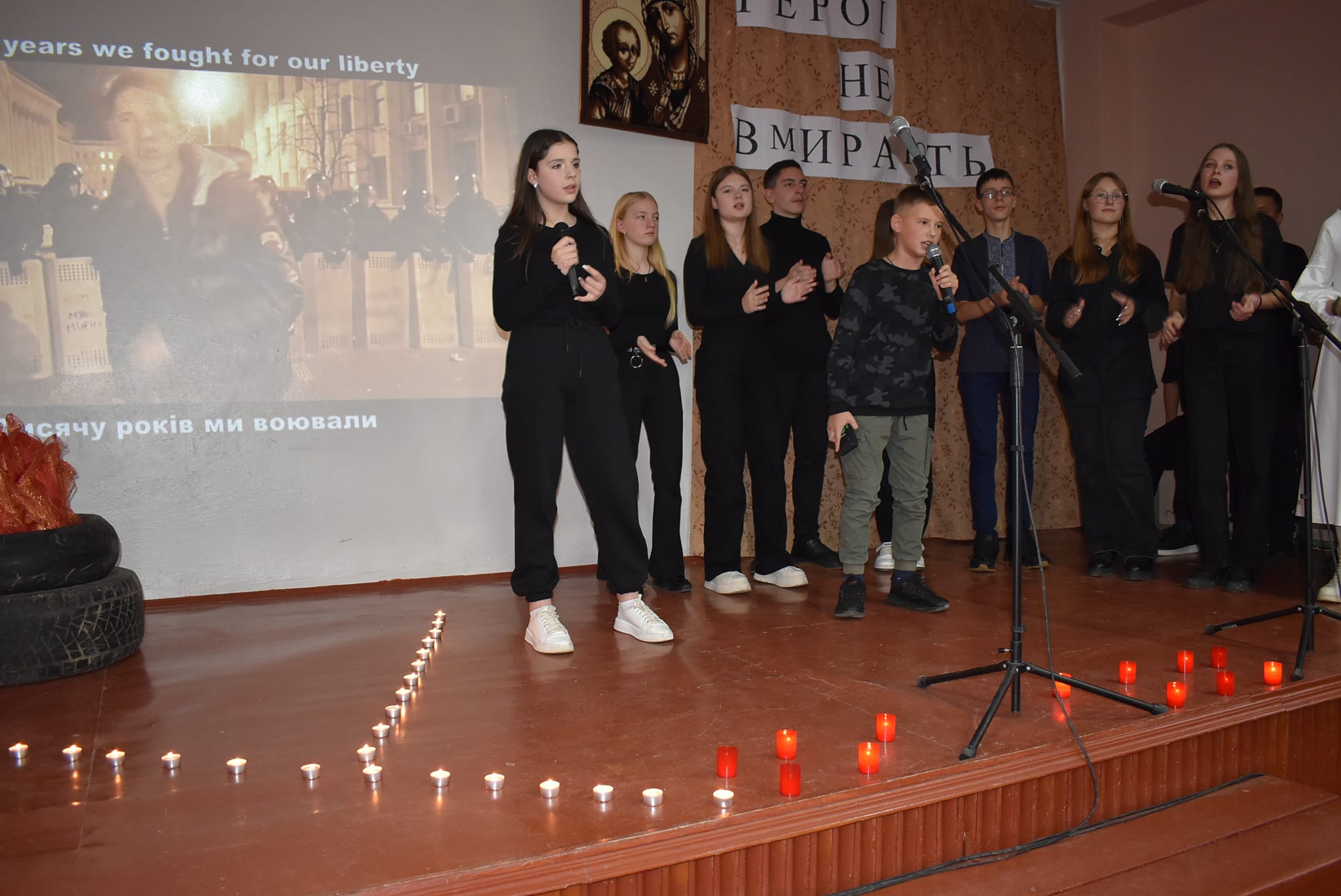 10 років тому відбулися великі зміни в серцях українців і по новому утвердилися ці поняття. Про ці недалекі події сьогодні під керівництвом п.Марії Гудзь розповіли лідери учнівського самоврядування та активні учні школи. Дехто з глядачів пригадав ці події, а дехто почув вперше. Імена молодих Героїв, трохи історичних фактів, віршів, а особливо пісень, які виконували учні, точно залишилися в пам’яті глядачів. Найбільш захопливо звучала пісня-реквієм ”Плине кача”, яку учні виконали без інструментального супроводу, самостійно організувавши маленький хор.