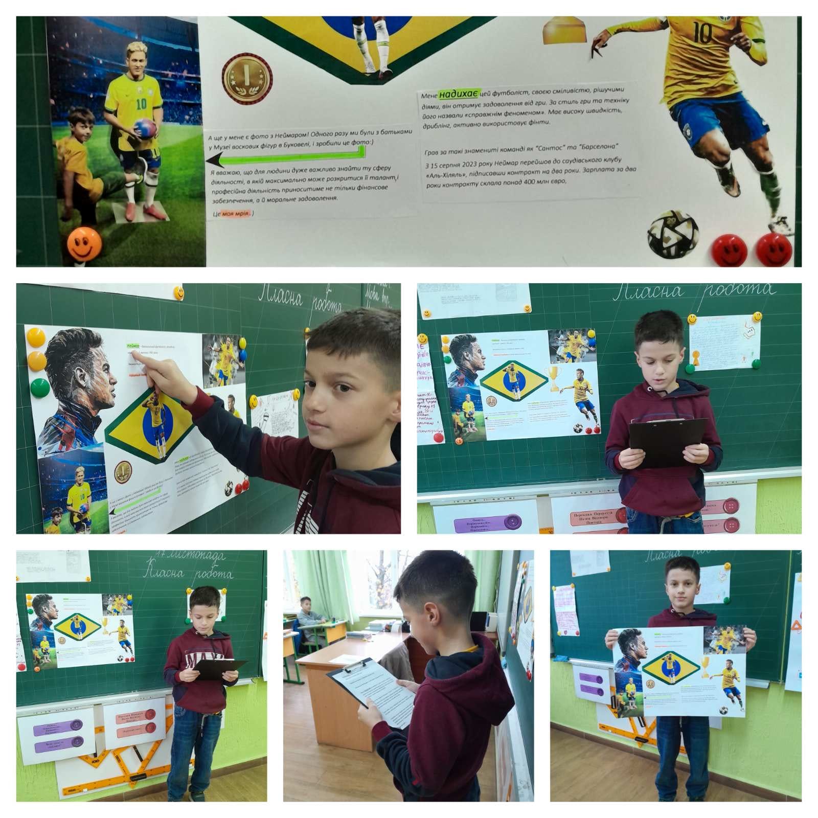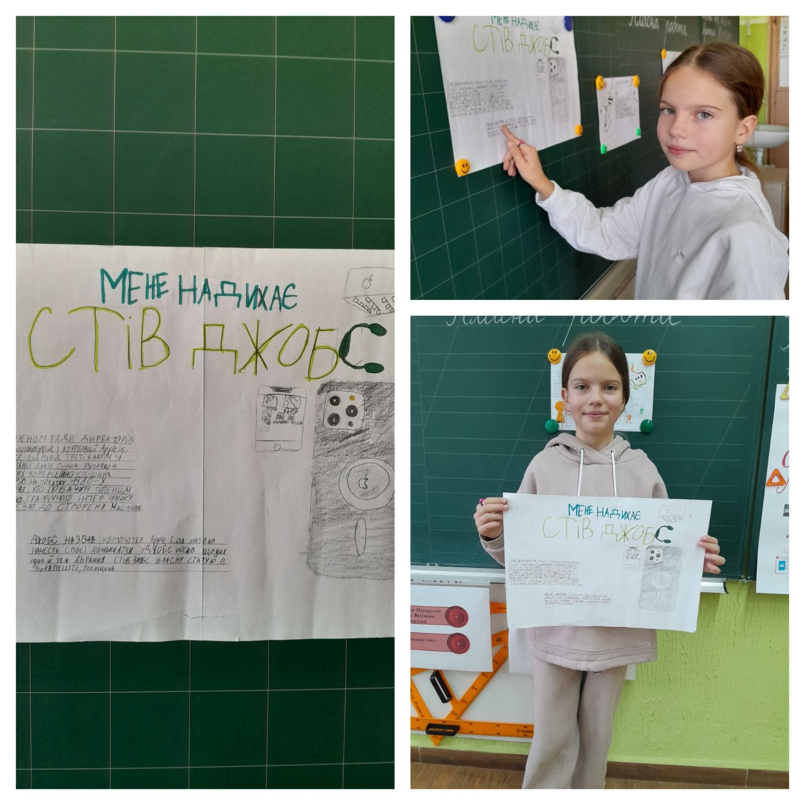 Ось учні 4-А класу завершили роботу над другим проєктом на тему “Людина, яка мене надихає”. Серед натхненників був Стів Джобс та Тіна Кароль, футболісти Неймар, О.Зінченко, Леонель Мессі та Кріштіану Роналду, репер Хас та корейська дівоча поп-група. Приємно було побачити і почути про нашого національного натхненника Степана Бандеру.