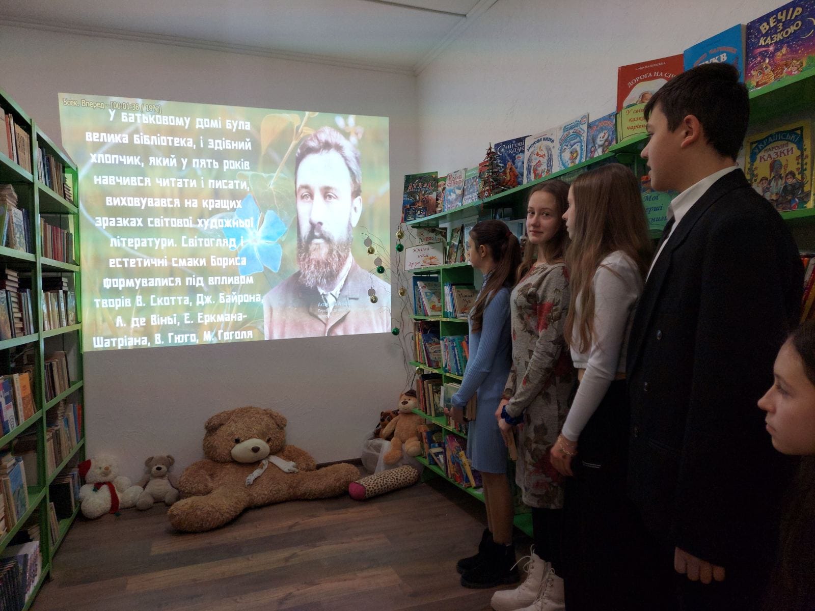 8 грудня у бібліотеці нашої школи пройшли літературні читання, присвячені 160-ій річниці з дня народження Бориса Грінченка на тему «Безкомпромісний лицар національної ідеї». Учні 7-В класу дізналися про теперішній шлях і творчість українського письменника. Бібліотекар Людмила Онисько підготувала презентацію біографії Б.Грінченка та уривок з оповідання «Без хліба», а учитель п.Людмила Свінціцька розповіла цікаві факти із біографії Б.Грінченка, борця за українську незалежність та самобутність. Учні 7-В класу підготували інсценівку із твору «Украла» і вміло передали настрій та переживання героїв. Цікавою була прочитана за ролями байка «Сорока». Проведення вікторини підтвердило,що присутні уважно слухали виступи однокласників. На святі був присутній працівник місцевої дитячої бібліотеки Наталя Кирилів.